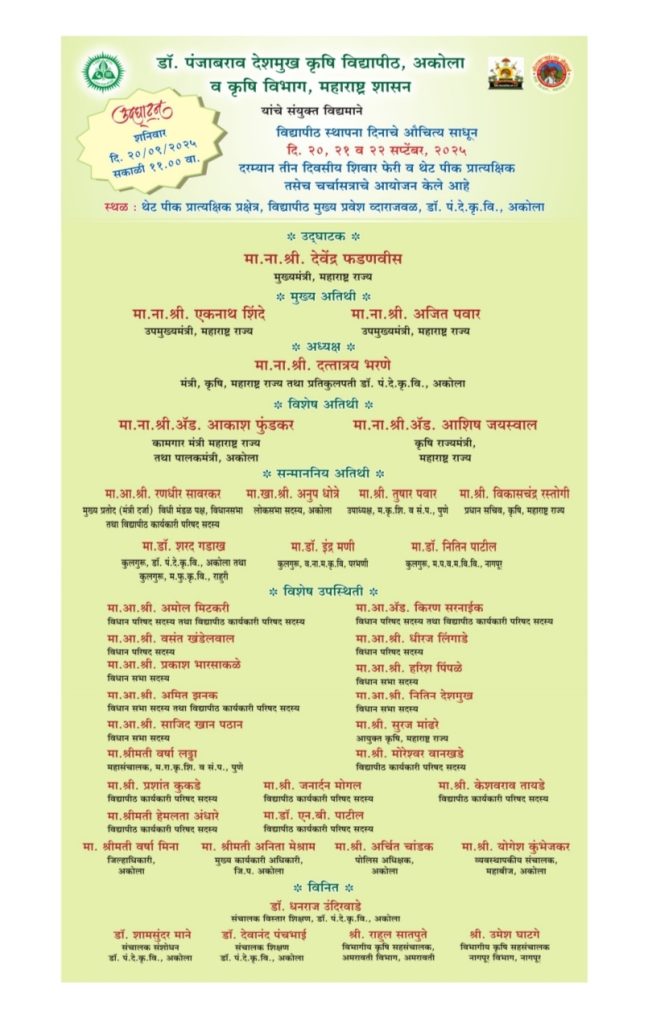 जागतिक हवामान बदलाच्या तथा व्यावसायिक स्पर्धेच्या या कालखंडात आमचा शेतकरी बांधव अत्याधुनिक शेती तंत्रज्ञान आणि पीक पद्धतीसह कृषीमाल प्रक्रिया आणि मार्केटिंगच्या क्षेत्रात अग्रेसर राहावा या हेतूने डॉ. पंजाबराव देशमुख कृषी विद्यापीठ विद्यापीठ, अकोलाद्वारे कृषी विभाग महाराष्ट्र शासन तथा इतर संलग्निक संस्थांचे संयुक्त विद्यमातून तीन दिवसीय खरीप शिवार फेरीचे आयोजन दिनांक 20, 21 व 22 सप्टेंबर 2025 दरम्यान डॉ. पंजाबराव देशमुख कृषी विद्यापीठाच्या अकोला येथील प्रक्षेत्रावर करण्यात आली आहे. यंदाच्या शिवार फेरीत प्रगत कृषी तंत्रज्ञान विषयक माहिती तर मिळणार आहेच, शिवाय विद्यापीठाचे संपूर्ण संशोधन प्रक्षेत्र तीनही दिवस प्रत्यक्ष अवलोकनासाठी शेतकरी बांधवांना खुले राहणार असून पीकनिहाय-तंत्रज्ञाननिहाय संशोधक शास्त्रज्ञांकडून माहिती तर मिळणार आहेत सोबतच आपल्या मनातील शंकांचे समाधान देखील या ठिकाणी करण्यात येणार आहे.