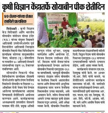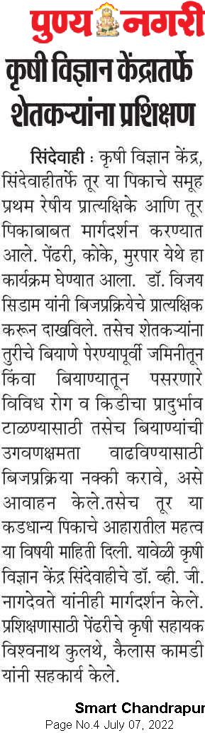 कृषि विज्ञान केंद्र सिंदेवाही तर्फे राष्ट्रीय अन्न सुरक्षा अभियान(NFSM) योजनेअंतर्गत तूर या पिकाचे प्रात्यक्षिके व शेतकरी प्रशिक्षण आयोजन