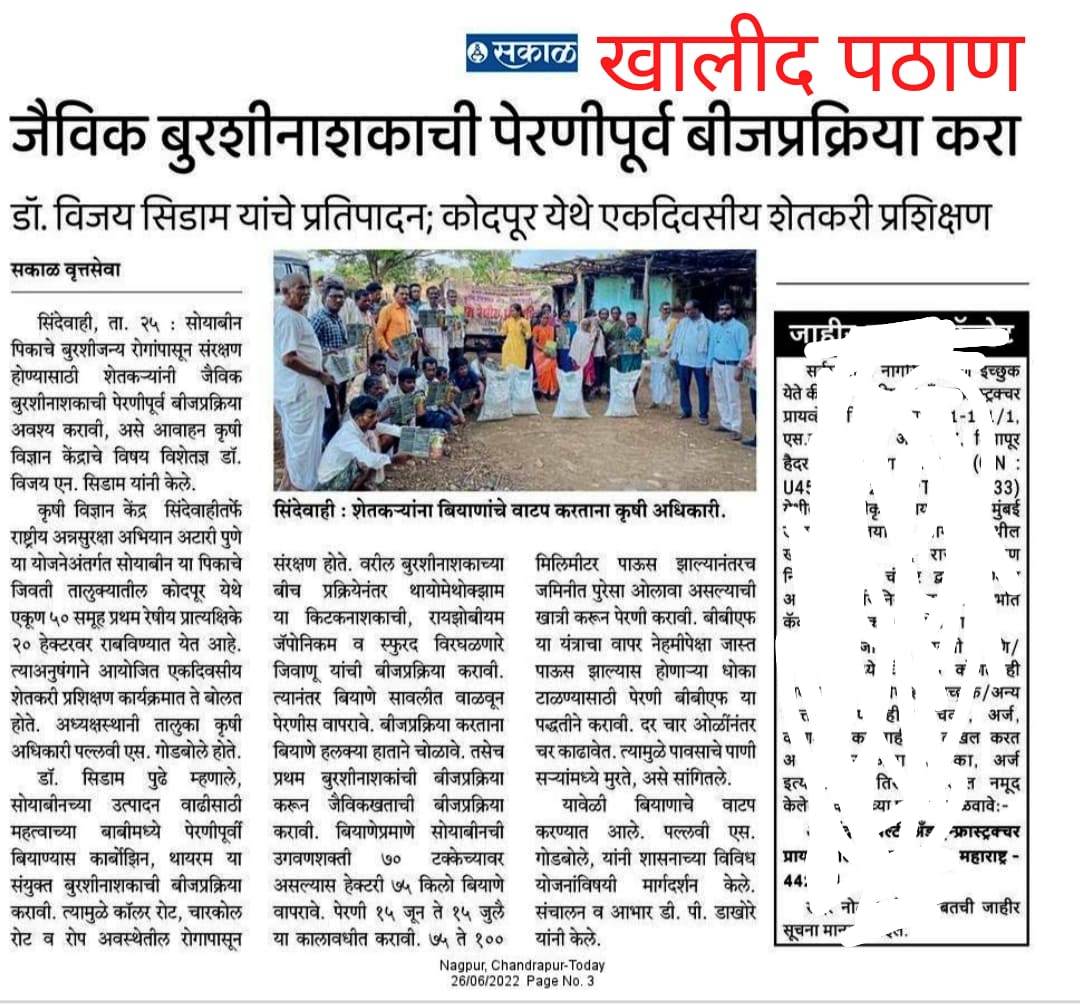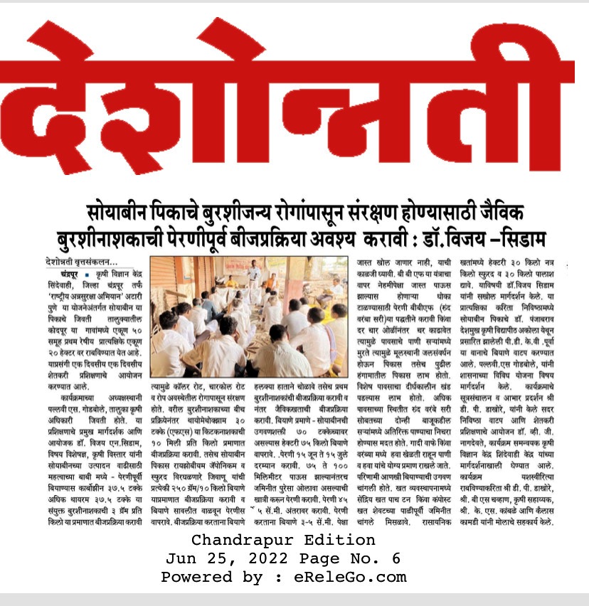 सोयाबीन पिकाचे बुरशीजन्य रोगांपासून संरक्षण होण्यासाठी जैविक बुरशीनाशकाची पेरणीपूर्व बीजप्रक्रिया अवश्य करावी- डॉ.विजय एन.सिडाम